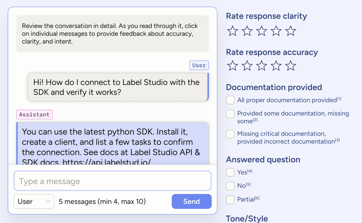 This configuration only allows per-message evaluation. An annotator must click on a message in the chat interface, and then options specific to that role appear on the right. For an example of using conversation-level evaluation, see Fine-tune an agent with an LLM.